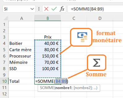 La somme automatique : cliquez sur l'icône somme,