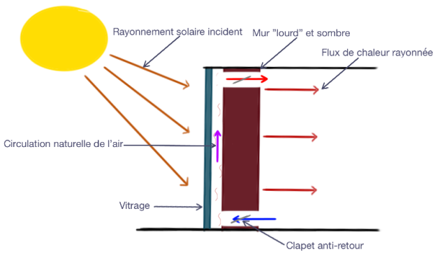 Cette énergie thermique est stocké dans le mur de couleur sombre derrière la vitre.